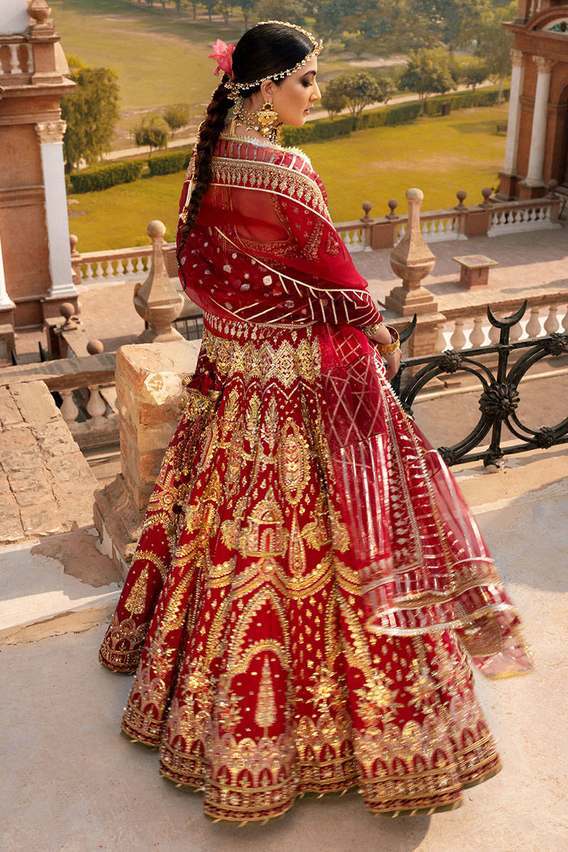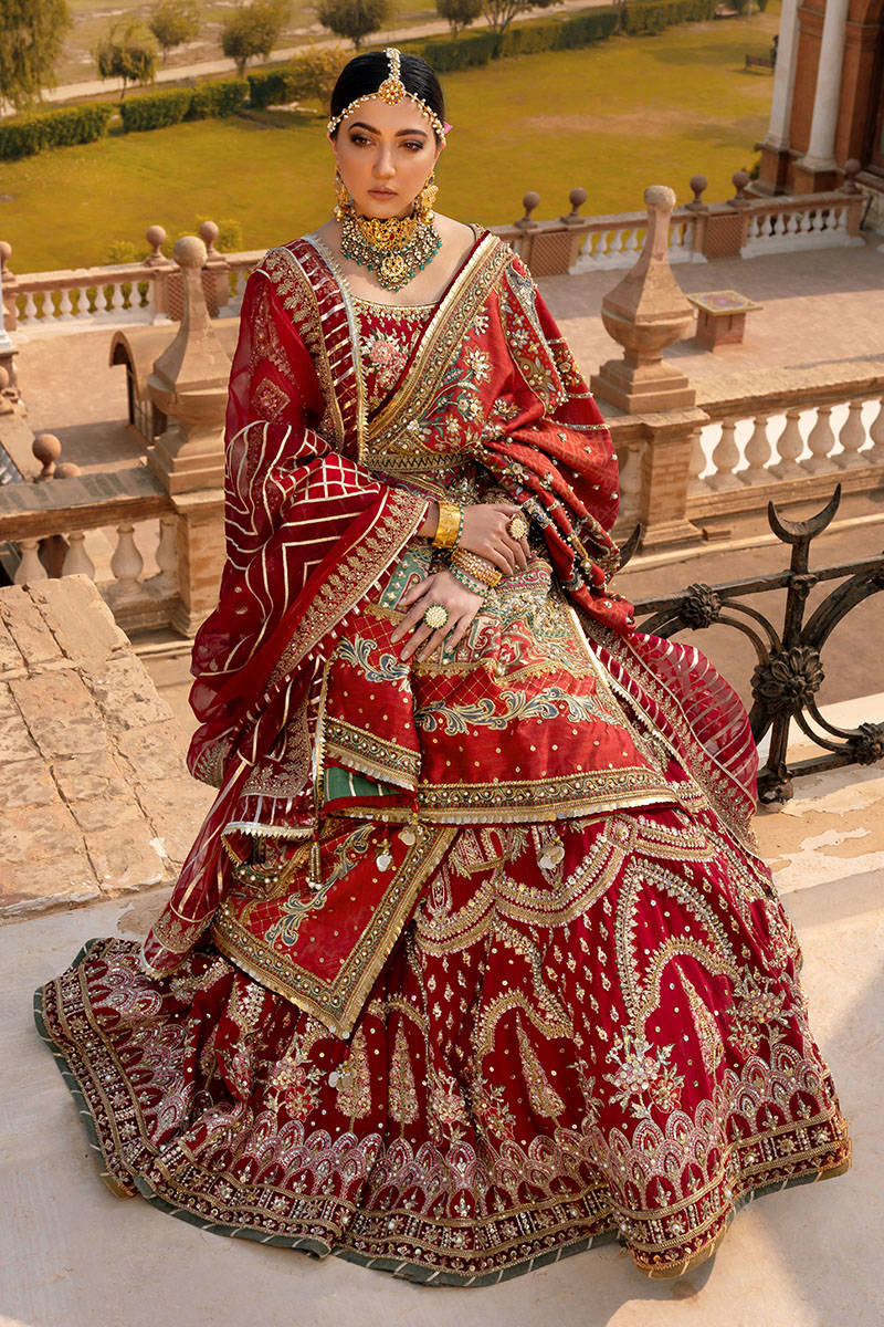Nigarbano is our signature sindoori bridal set that comprises of a Russian silk lehnga choli extensively embroidered and composed using hand crafted embellishments of dabka,kora,sitari,pearl and marori. It comes with an embroidered and embellished dupatta finished with our signature chatta patti pallus and worn with a digitally printed silk shawl with hand embellished hammer work, dabka, pearl and gotta.