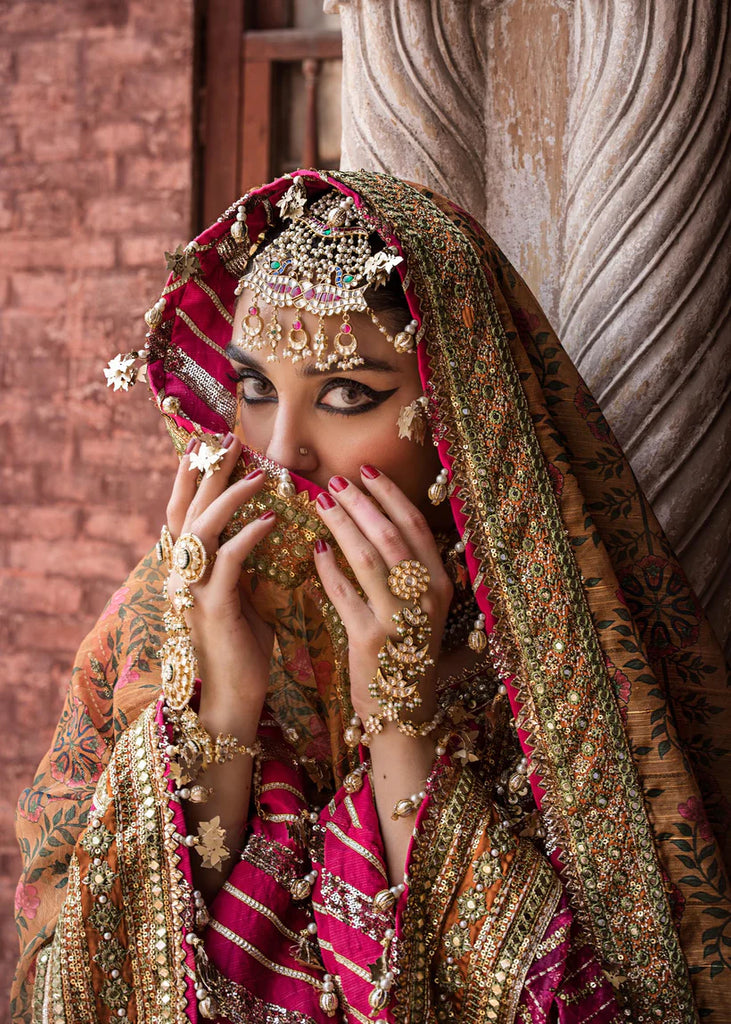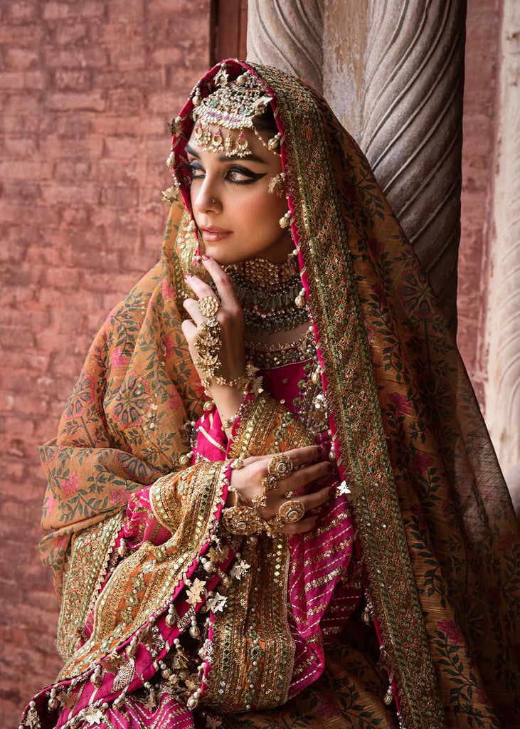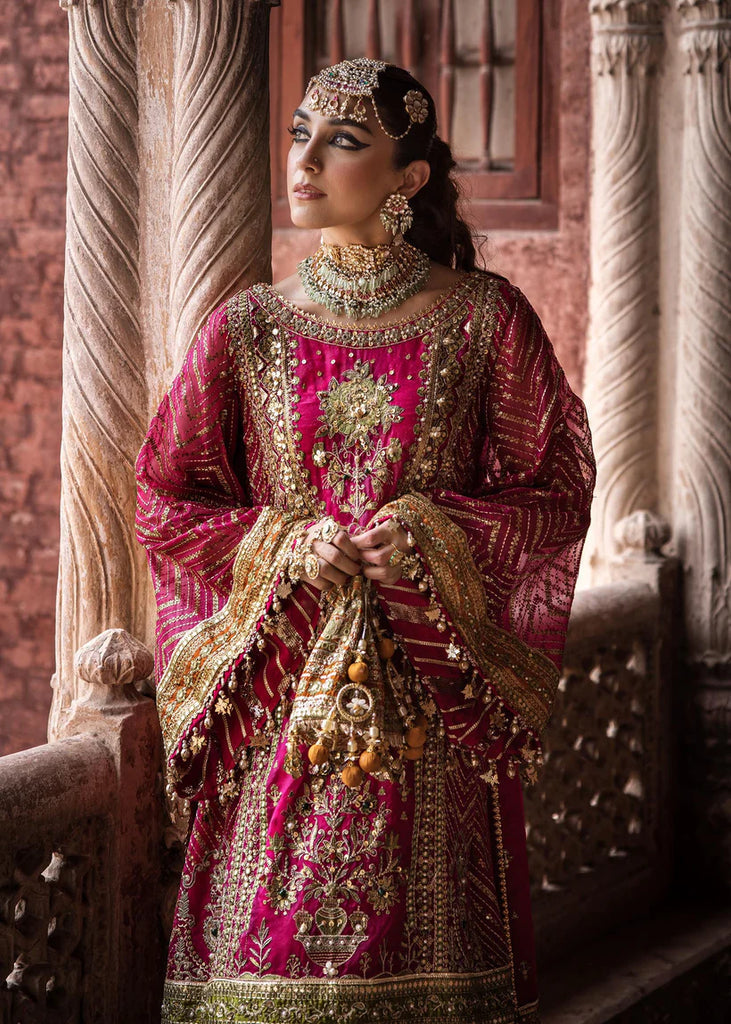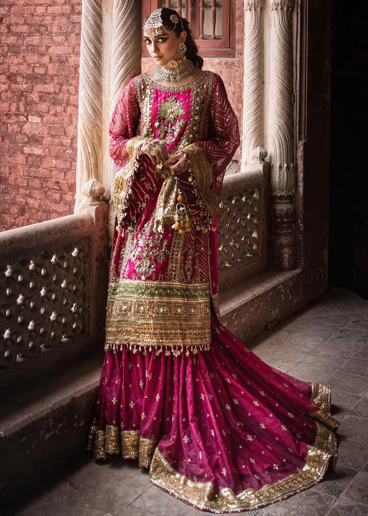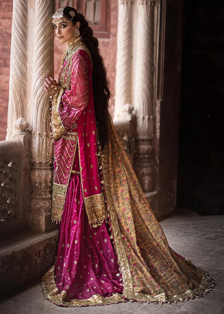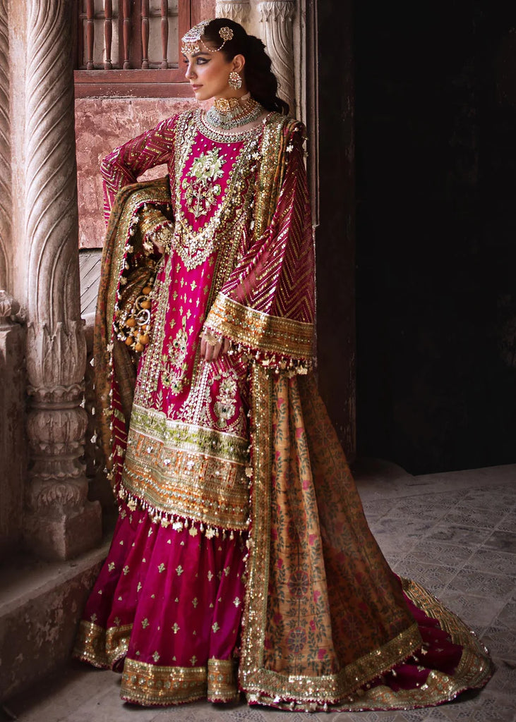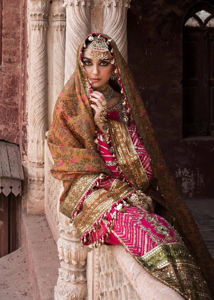 Step into the lush and vibrant world of 'Naranji Bagh,' where the ensemble's rani pink and red hues are a testament to its opulent charm. The embroidered organza shirt is a masterpiece, adorned with exquisite hand-embellished pearls, sequin and mirror work, and allover sequin detailing on the sleeves. Two different satin silk borders in parrot green and mustard add a unique and lively contrast. The embroidered gharara, enriched with intricate details and embroidered satin silk border, adds a touch of sophistication to this ensemble. The printed dupatta on cotton slub, adorned with sequin and embroidered four-side satin silk border, completes the picture of timeless elegance. 'Naranji Bagh' is a celebration of color and craftsmanship, ideal for brides who seek an extraordinary and unforgettable look.