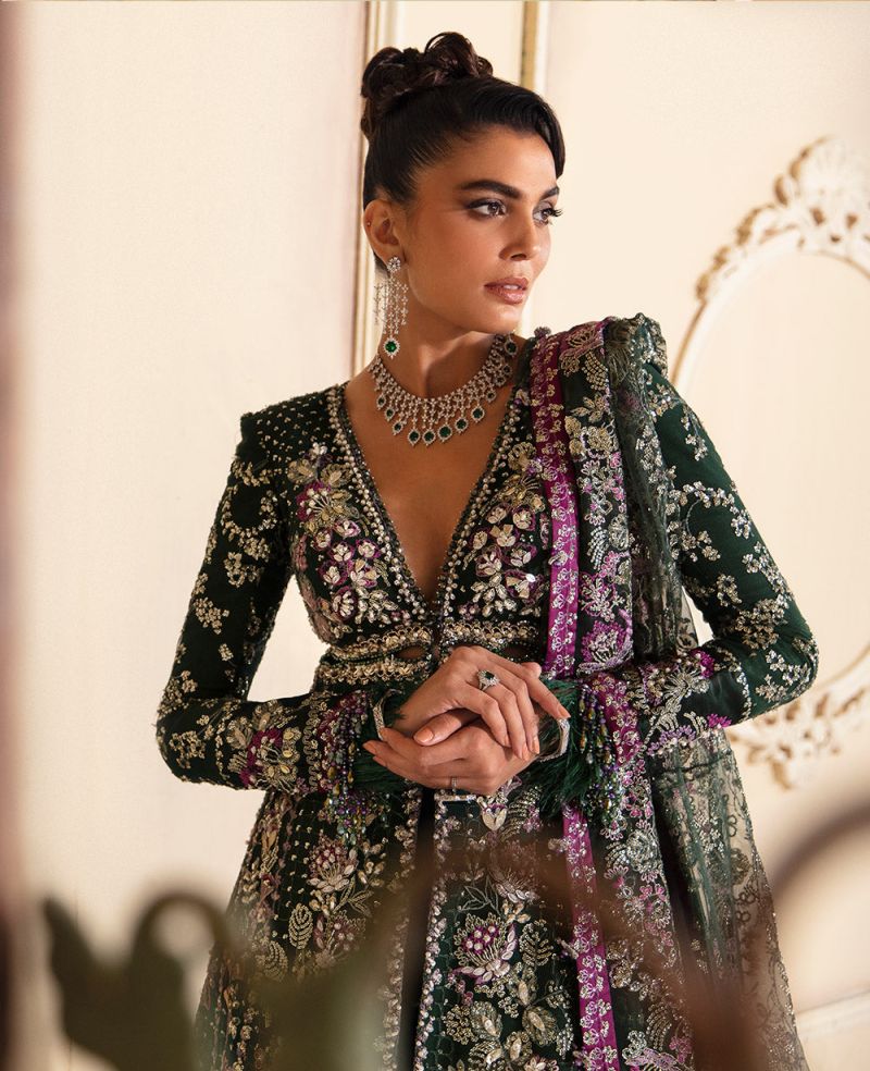 A secret garden created in the form of a forest green apparel adorned with florals of monochromatic and wine shades while the light gold sequin and tilla is etched beautifully in between. The transparent and lucent top has a blooming floral pattern while pattern runs down in panels showing the depth of a secret garden.
