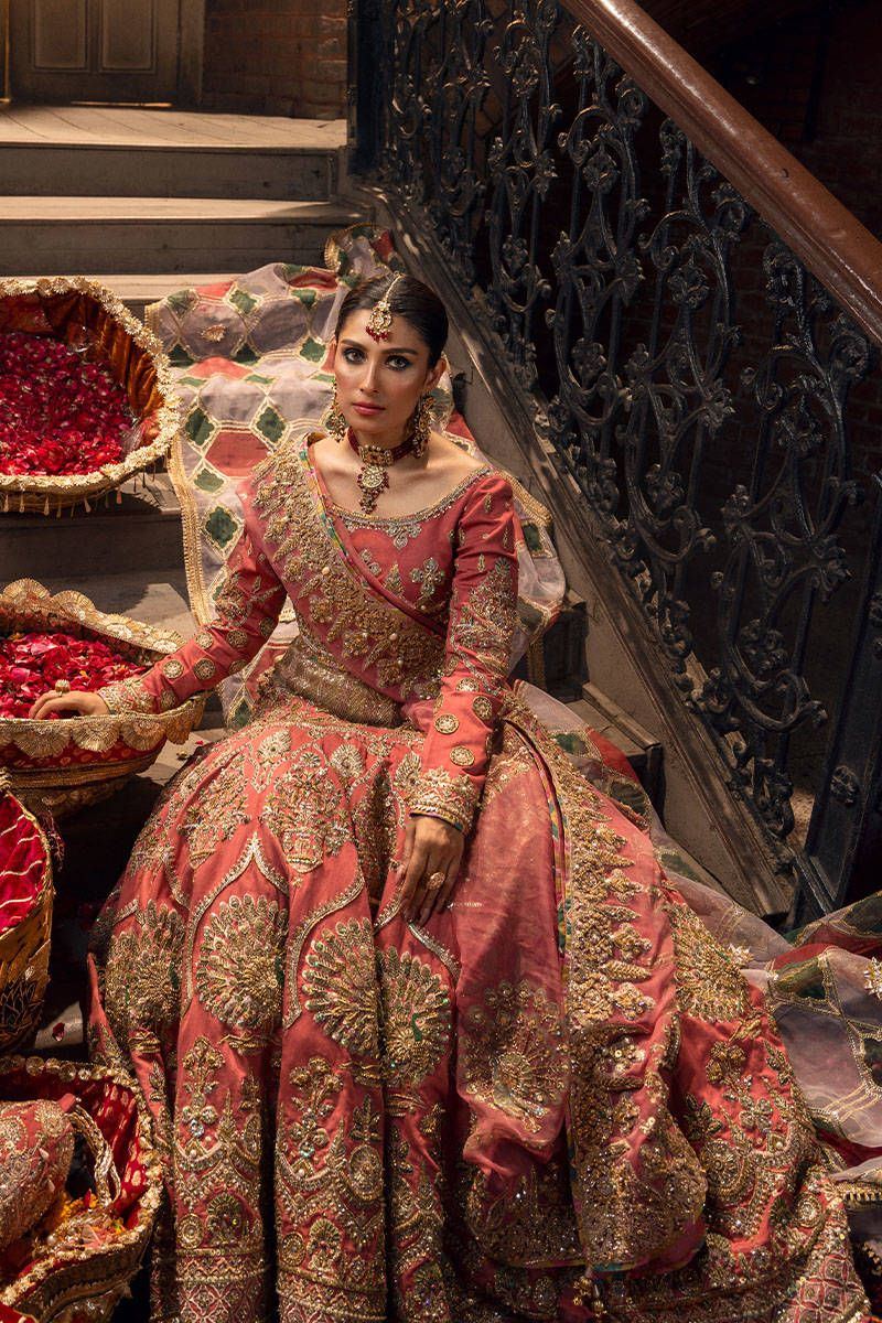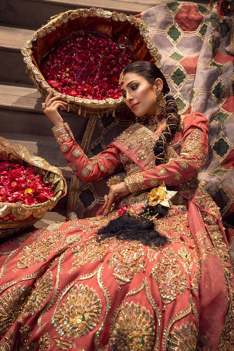 Sabaa Is our rose pink traditional lehenga choli bridal ensemble. This dazzlings ensemble exudes the radiance a bride-to-be needs. The full sleeved choli is exuberantly embellished with threadwork, sequins and beads. The lehenga features arches inspired by colonial architecture of Lahore, along with peacocks and Mughal floral motifs that have been heavily worked on oozing exceptional bridal charm. The ensemble is paired with a matching pink dupatta replete with thick border of embroidery replete with spectacular work that will surely inspire you